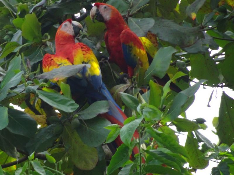 Unüberhörbar die lauten, kehligen Rufe der Brüllaffen. Ihre Rufe klingen für mich jedes mal wie eine wilde Löwenherde, die lauernd auf der Veranda auf mich wartet. Zu Anfang ist es ein wenig irritierend, zugleich auch faszinierend. Die Brüllaffen zählen in Costa Rica zu den stimmgewaltigsten Tiere im Dschungel, doch überwiegend sind sie recht ruhige Bewohner. Ich habe sie oft in den Baumkronen beobachten können, wie sie stundenlang friedlich zwischen den Ästen hingen. Unterwegs auf meinen Entdeckungstouren fühlte ich mich, als würde ich einen tiefgrünen Teppich durchwandern. Herabhängende Luftwurzeln, großblättrige Pflanzen und riesige Bäume, die bis zu 30 m hoch werden können. Farbenprächtige Ara Papageien zwischen den Ästen und pralle Mangos, die von den Bäumen fallen. Gleichzeitig prasselt ein Gemisch von Sing Sang, Zwitschern, Zirben und undefinierbaren Dschungelgeräuschen auf mich ein. Was für eine Fülle!